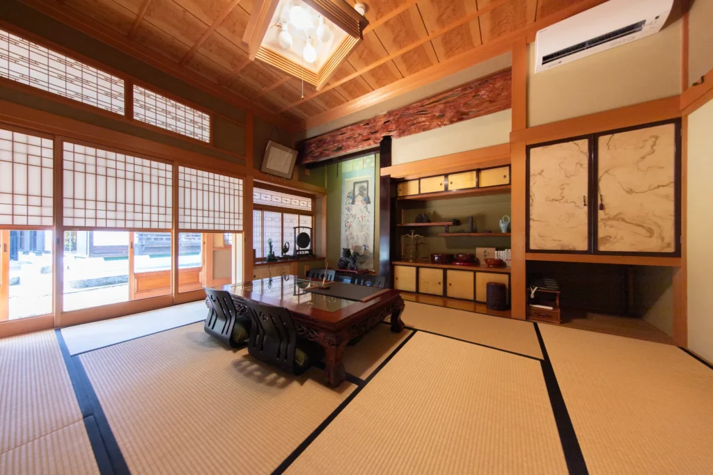 The centre of a traditional Japanese room features a low table, known as a zataku, which is surrounded by floor cushions or legless chairs. Sitting on the floor at this table is the standard way to relax in a ryokan.
