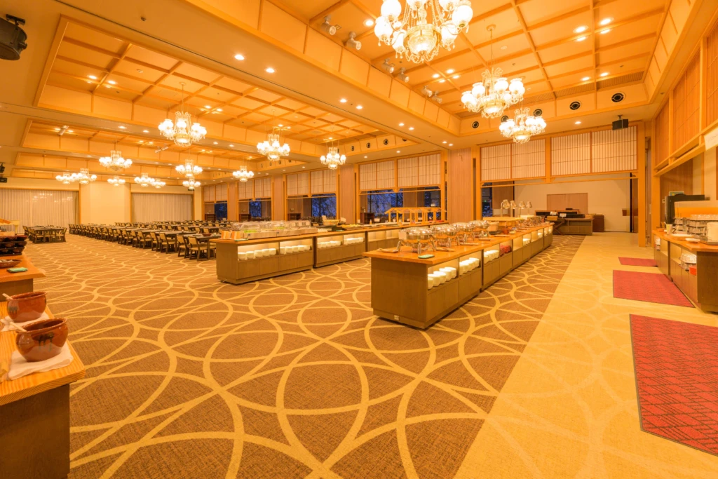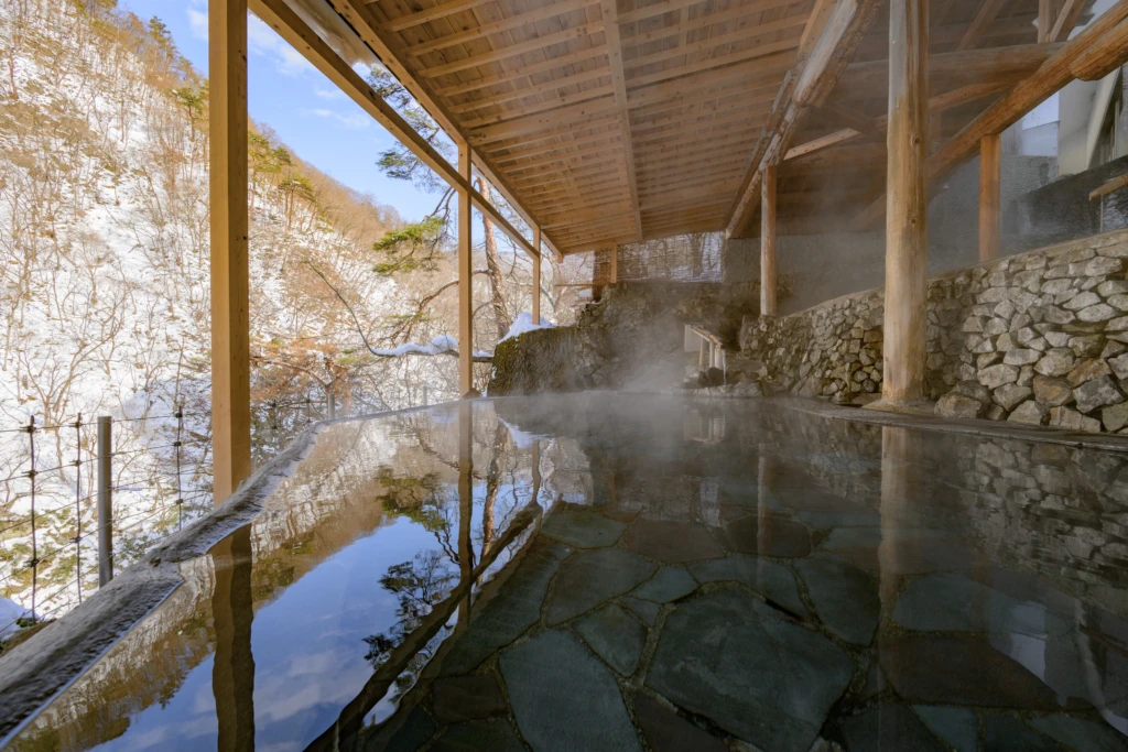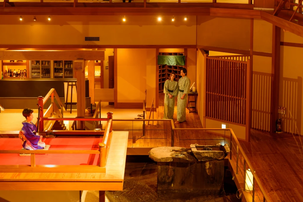 At the heart of the building is a floating stage, where the sound of the shamisen softly fills the air. Beyond it, snow-covered gorge scenery unfolds before your eyes.