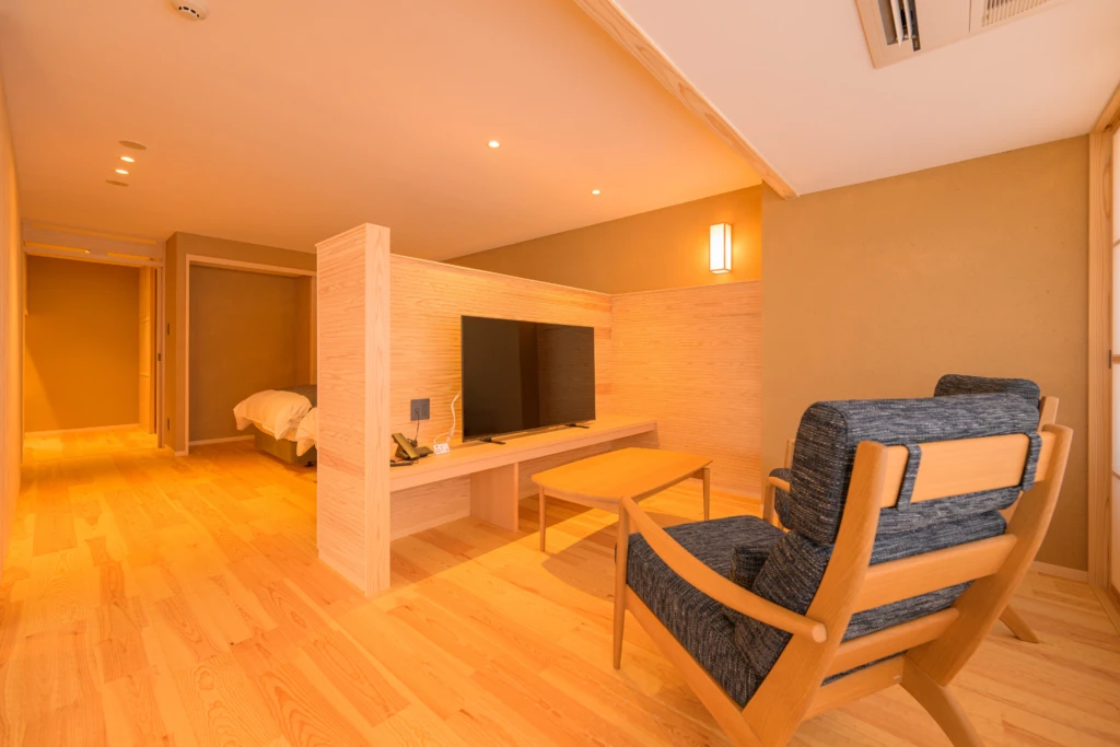 The room is equipped with a private sauna and an open-air onsen bath with natural hot spring water flowing directly from the source. Everything can be enjoyed in complete privacy, all within the comfort of the room.