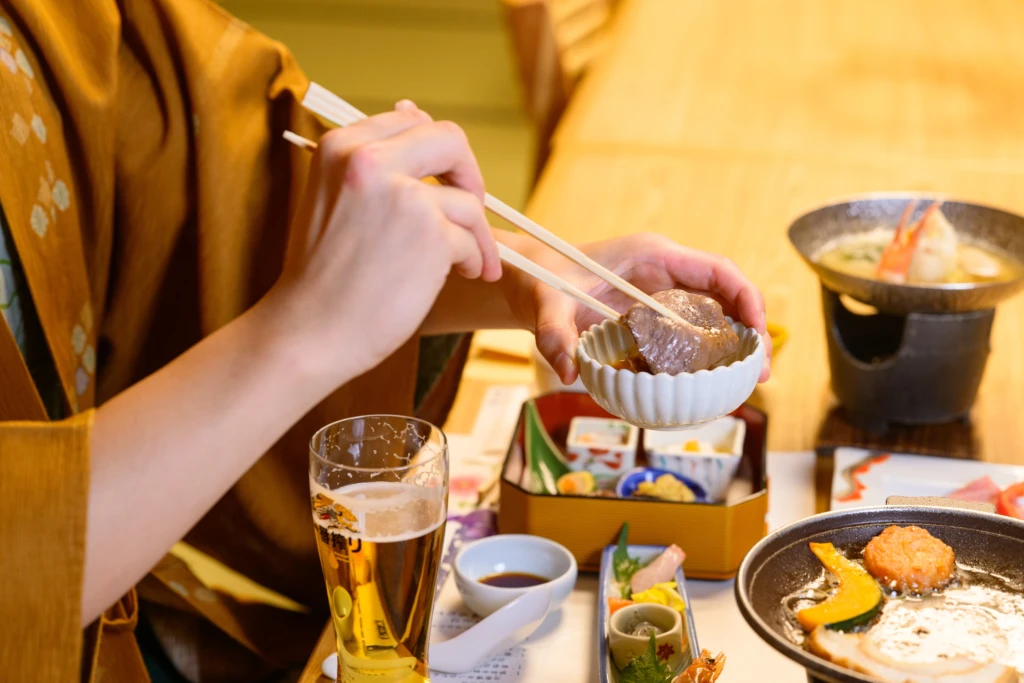 Dinner is served at Bimikyushin KAWADOKO, an authentic Japanese kaiseki dining space.