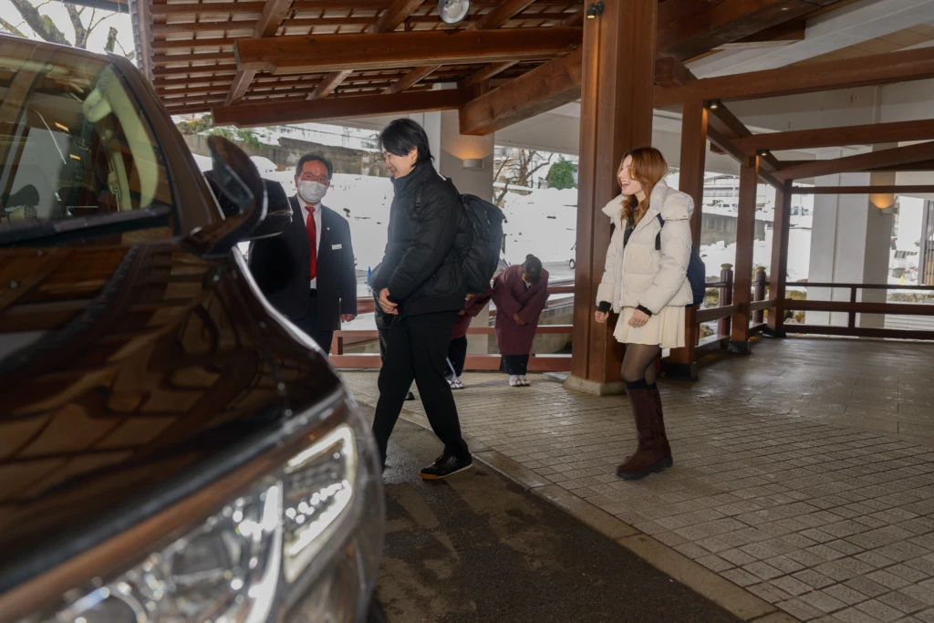 After calling for our private car once again, it was time to leave Ookawaso. Holding back our lingering feelings, we decided to quietly savor the afterglow of the stay as we rode away.