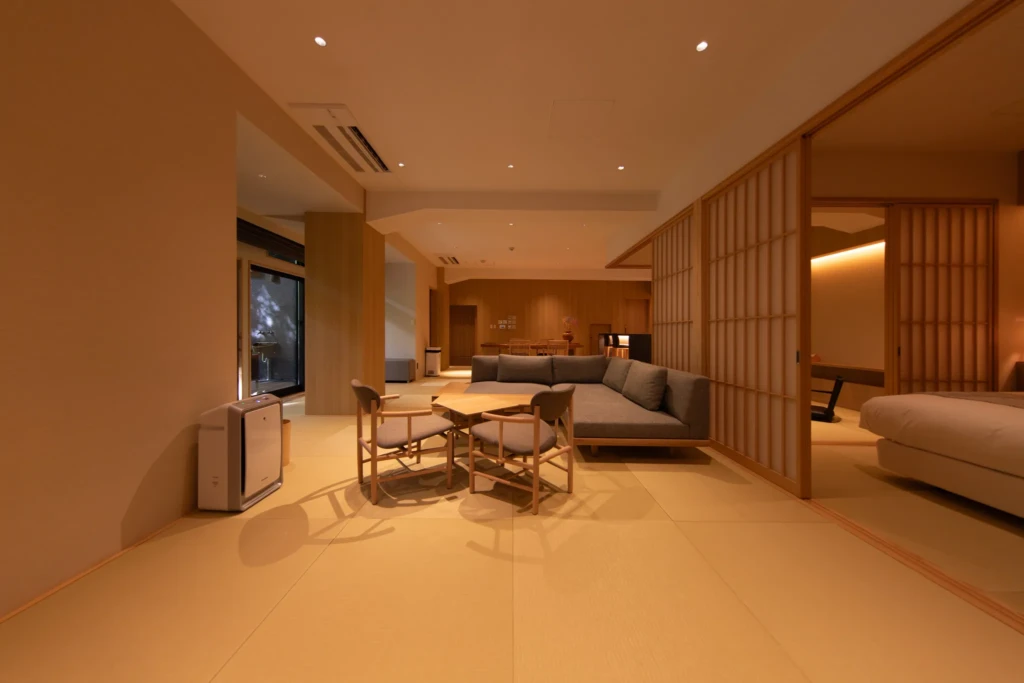 This is the Royal Suite, the one and only room available to a single group each day. While preserving a traditional Japanese atmosphere, the space features modern Scandinavian-inspired furnishings that create a refined and luxurious design. The entire floor is covered with soft-toned tatami, and walking on it barefoot felt incredibly soothing—the gentle texture easing the fatigue in my feet with every step.