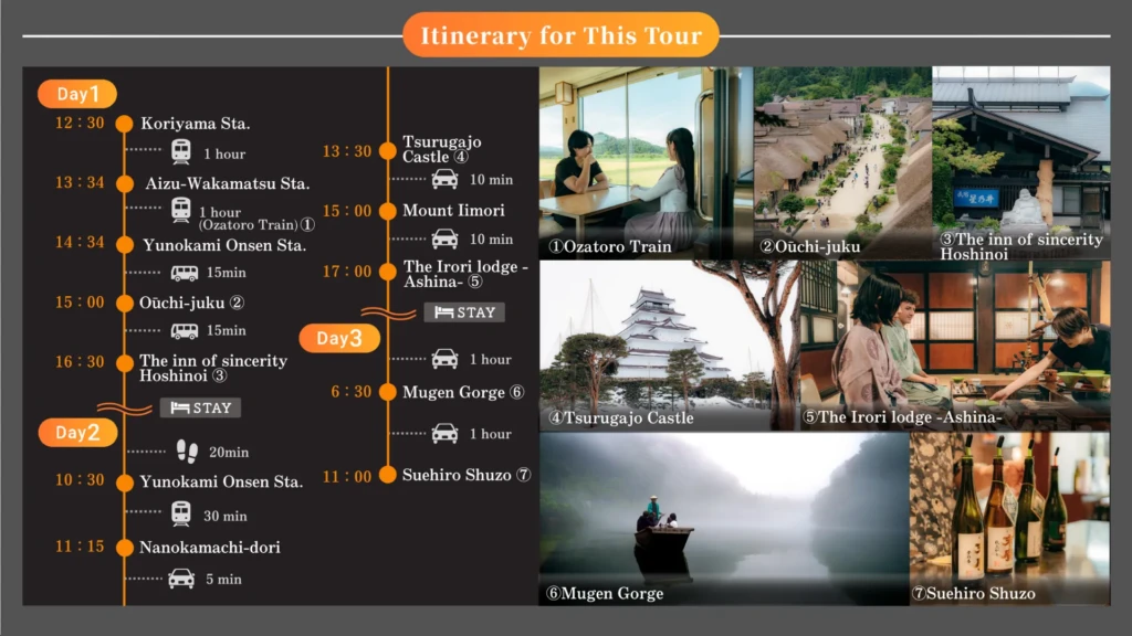 | Duration | 3 Days Day 1: Minamiaizu Area Day 2: Aizuwakamatsu City & Higashiyama Onsen Day 3: Oku-Aizu & Sake Brewery Area |