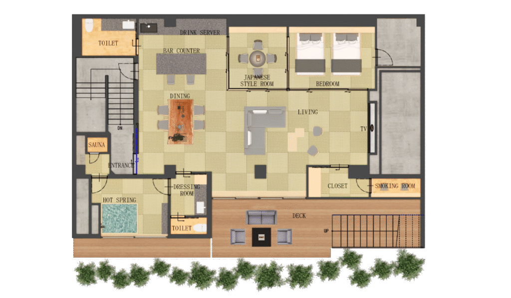 Inside, you’ll find a spacious living room with a large TV, a dining area with a bar counter, a serene tea room, and a bedroom furnished with two Simmons semi-double beds. The suite also features a fireplace terrace overlooking a lush bamboo grove and a private hinoki bath with natural hot spring water and a sauna—a sanctuary of relaxation that can accommodate up to four guests.
