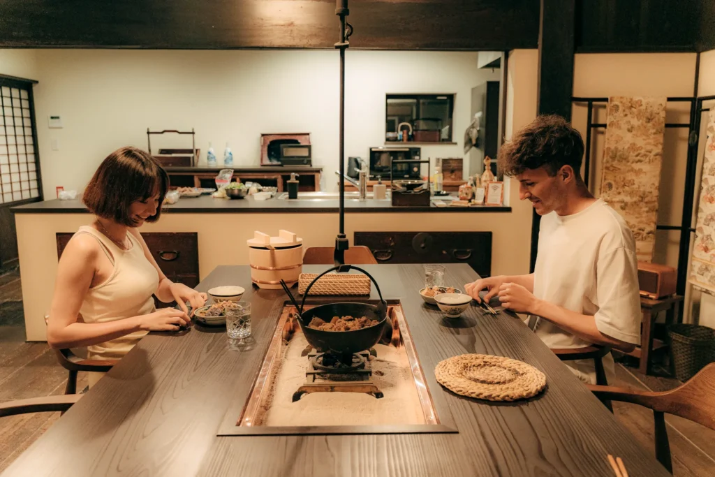 The dinner at Yukinoya Furusawa-tei is very flexible, letting guests enjoy it in their own way. The kitchen is fully equipped, so you can cook your own meals with ingredients you bring, or order a local ingredient kit—either a local chicken sukiyaki set or a Tsuma pork shabu-shabu set—and prepare it yourself. Cooking during your trip is sure to be a memorable experience. Guests also receive a gift of Uonuma Koshihikari rice, which can be cooked in a traditional clay pot for dinner or taken home as a souvenir.