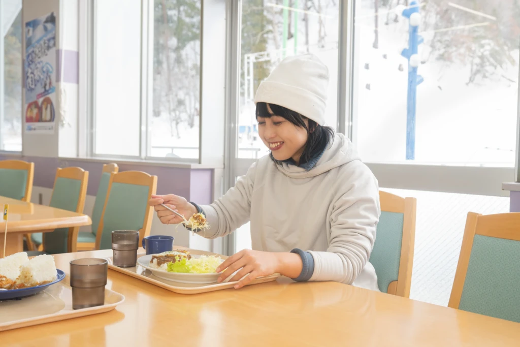 On clear days, you can enjoy skiing while taking in the beautiful contrast of blue skies and a snow-covered landscape known as “Nango Blue.” When the weather is good, we recommend starting early in the morning, gliding down the slopes in the crisp, refreshing air. When you get hungry, stop by the central lodge or Nango Lodge for a warm meal. The main restaurant inside the central lodge offers unique dishes such as tomato cheese ramen and tomato sauce katsudon, which are popular with visitors. Nango Lodge, open on weekends only, is well known for its signature jingisukan (grilled lamb) set meal.