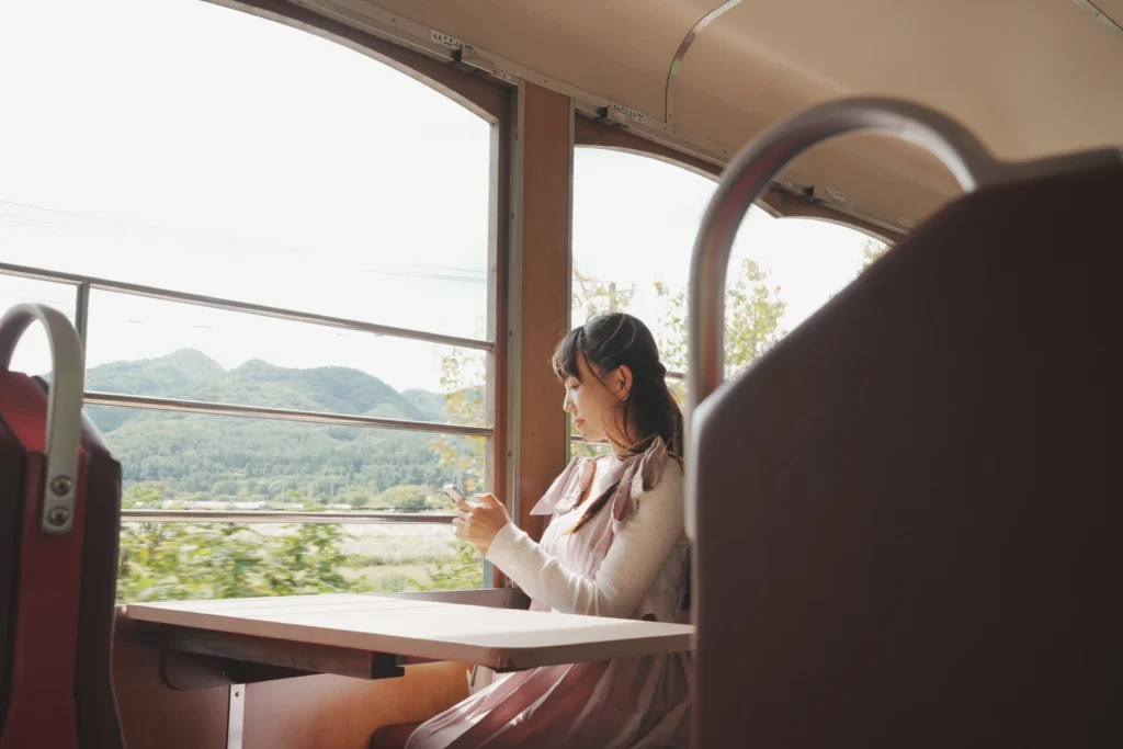 The biggest appeal of the Oza-Toro Sightseeing Train is its open-air torocco seats. From late April to early November, the windows are removed, allowing passengers to feel the refreshing breeze while taking in the stunning views of valleys and rural landscapes up close.
