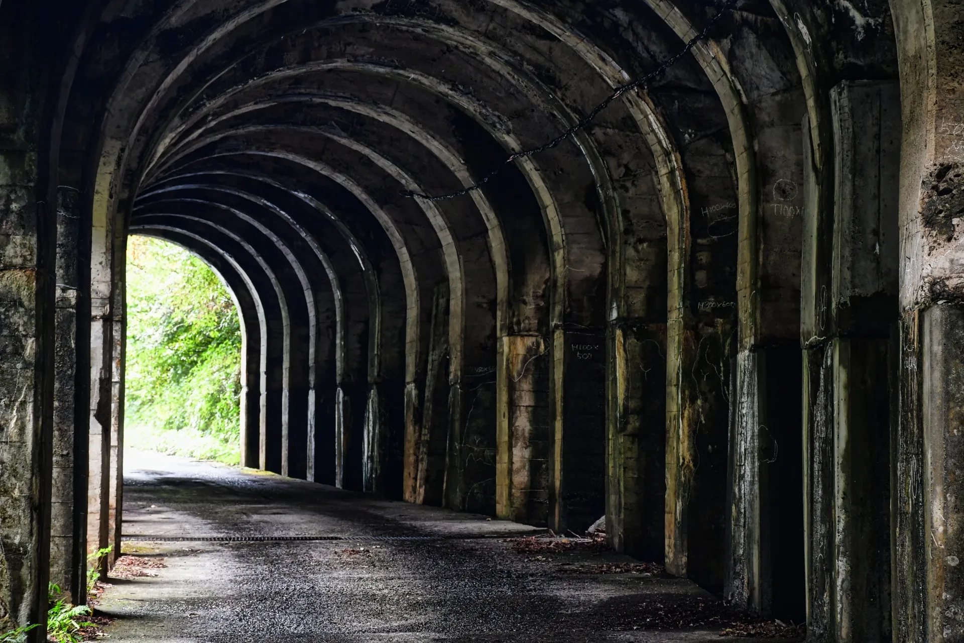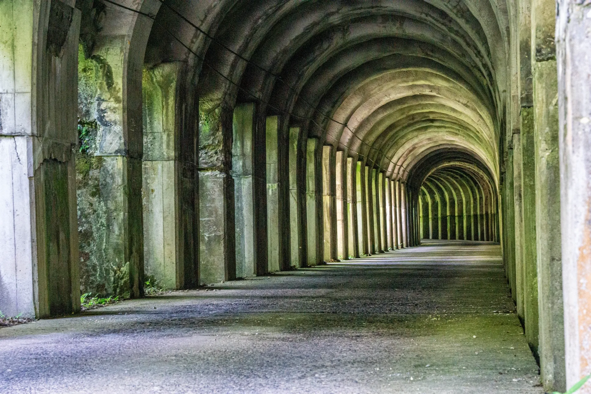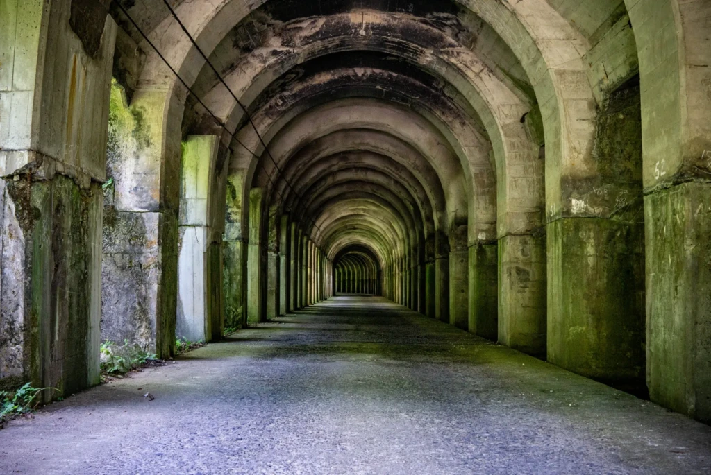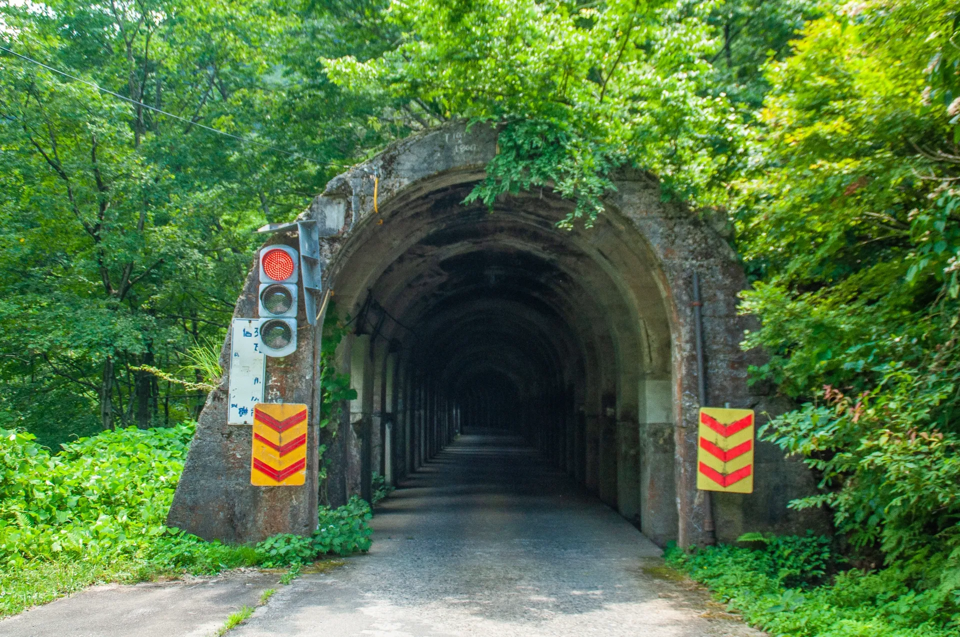 洞門內部彷彿與外界隔絕般的寧靜與涼爽,讓人有如迷失在異世界般的非日常體驗。天井上殘留的漆黑煤煙,則是昔日蒸汽火車在此通過的痕跡,使人能感受當年的產業歷史。