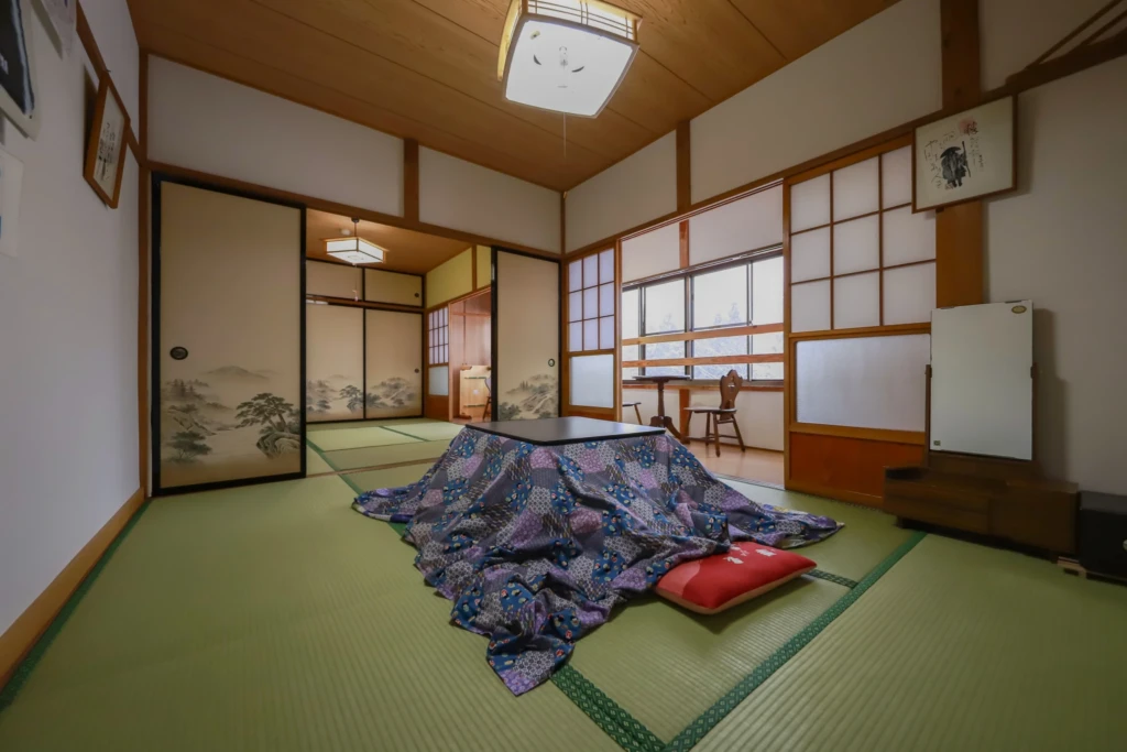房間中央擺放著暖爐,茶具也已準備妥當。被褥需自行鋪設,這同樣是入住和室時,日本特有的一種生活儀式。