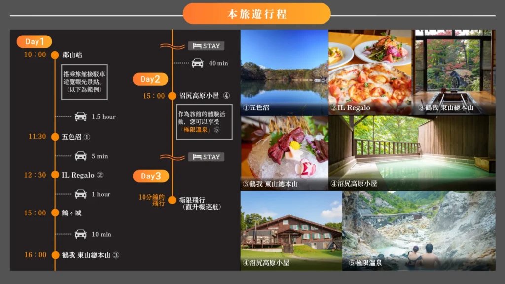 這次要介紹的會津3天2夜模範行程,不只是走訪觀光景點,而是一場以「大人的奢華冒險」為主題的旅程。入住一天僅接待一組客人的專屬旅宿,享受為旅程量身打造的細緻安排;在日本湧泉量第一的源泉中,與自然完全融合;最後以沼尻大地的空中俯瞰,為旅程畫下壓軸。