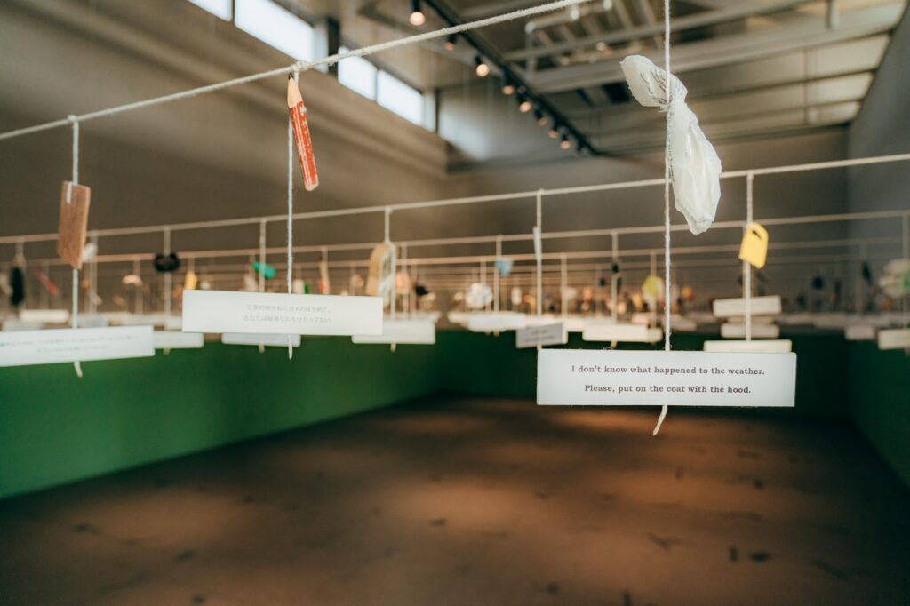 尤其令我難忘的是那件吊掛式的裝置藝術。無數細繩自天花板垂下,綁著被遺忘的物件──紙巾、碎紙、襪子……每一件下方都附有簡短的訊息。
