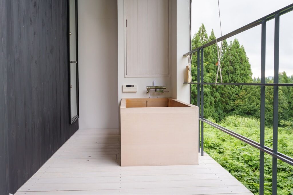 踏上陽台,檜木香氣撲鼻的露天風呂迎接而來。一浸入湯中,木香與穿過森林的涼風撫觸肌膚,呼吸也隨之平靜。