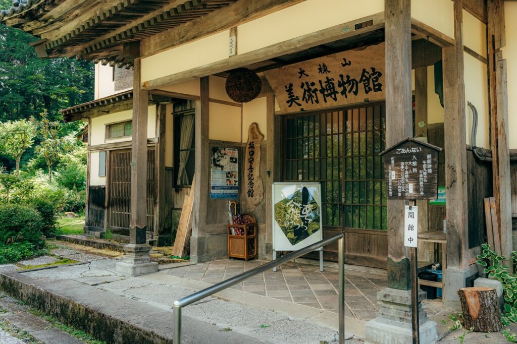 從美人林開車 6 分鐘即可抵達。這裡原是擁有 700 年歷史的舊家—村山家宅邸,現改為大棟山美術博物館。作為庄屋與釀酒家族,其歷史從踏入館內的一刻就緩緩滲透。