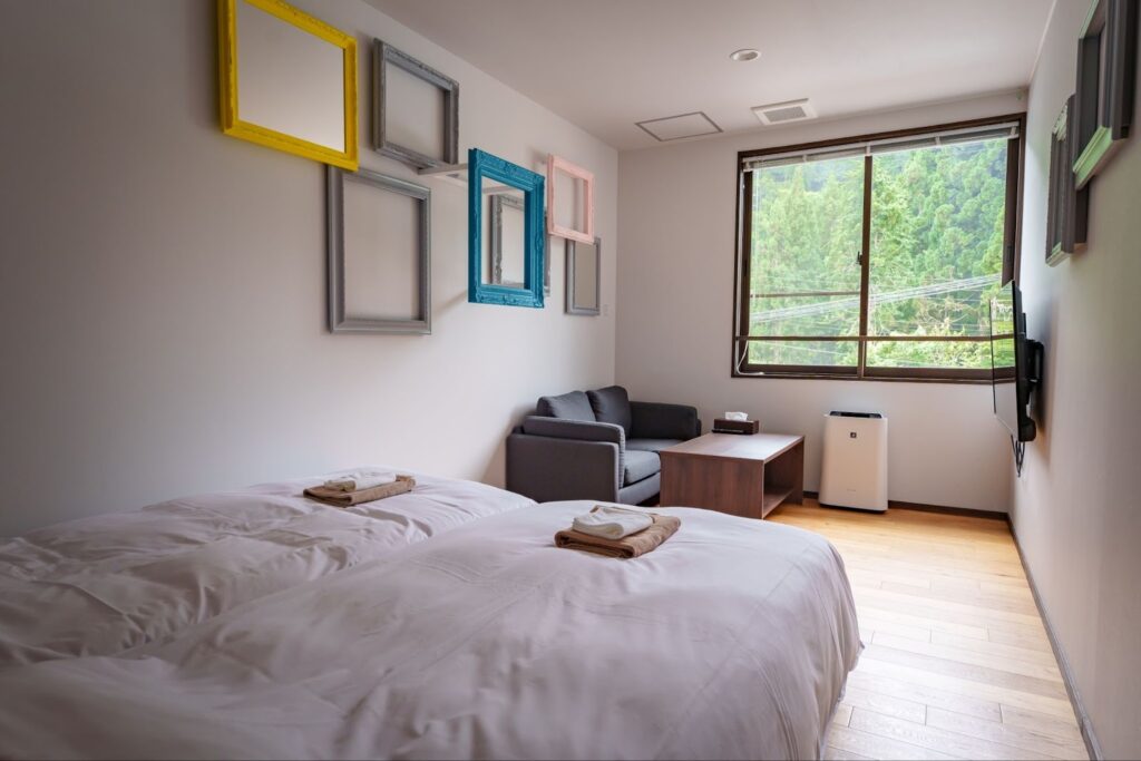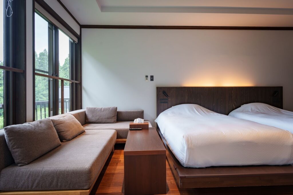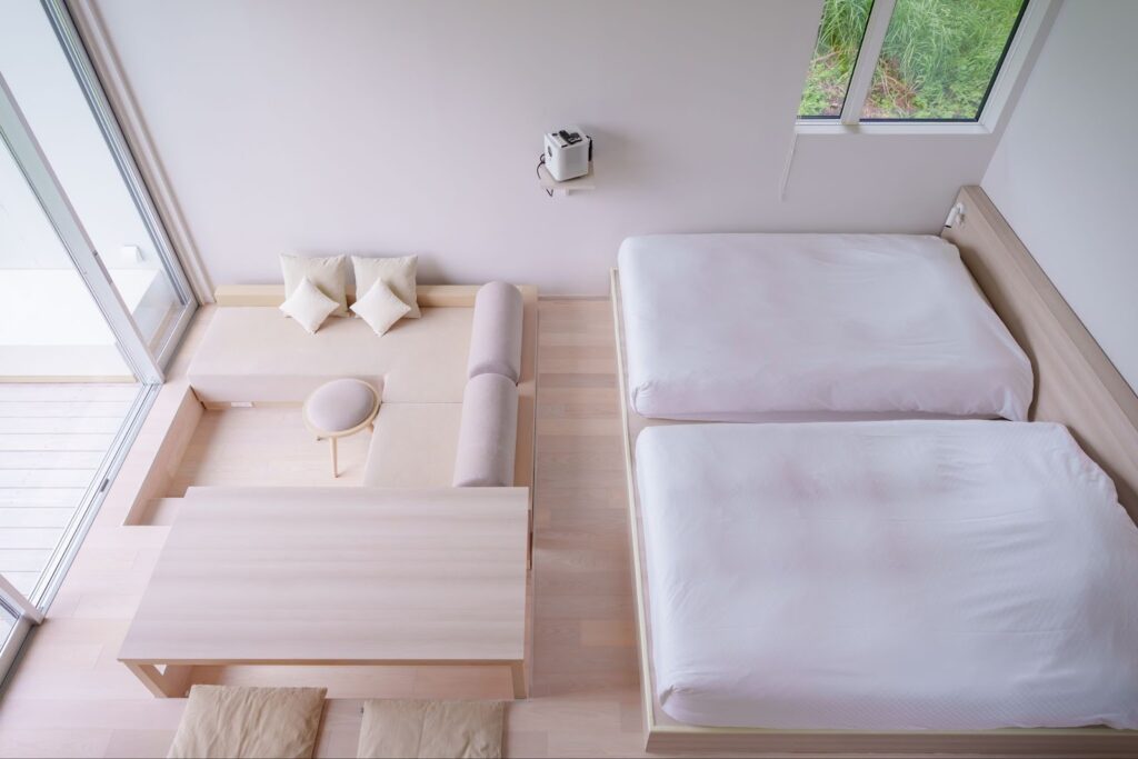 除了私人別墅,本館共有 8 間客房。從以深林為靈感的沉穩房,到以藝術點綴的現代緊湊房,各具特色。可依旅行目的與人數,挑選最適合的住宿風格,這也是《醸す森》的魅力所在。