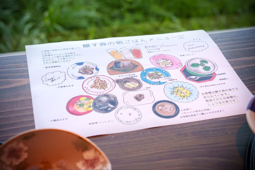 《醸す森》的早餐與前晚晚餐風格不同,由當地媽媽們一一用心製作的日式定食。這也是我喜歡這間旅館的原因之一。