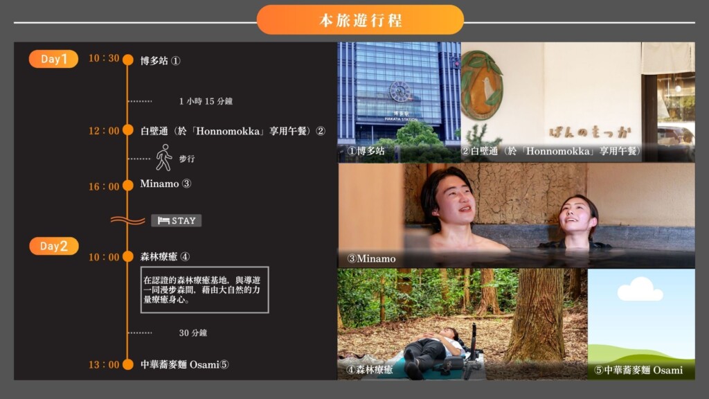 行程體驗:從福岡市區驅車前往浮羽。在「白壁通」悠閒漫步,感受充滿歷史底蘊的古老街道,午餐則在人氣麵包店「Pan no Mokka」的露台享用。傍晚,入住由分散式古民家改建的旅宿「水面(Minamo)」。在利用浮羽清澈湧泉的桑拿與檜木浴池中,度過一個身心深度放鬆的夜晚。迎接靜謐而優雅的夜晚。