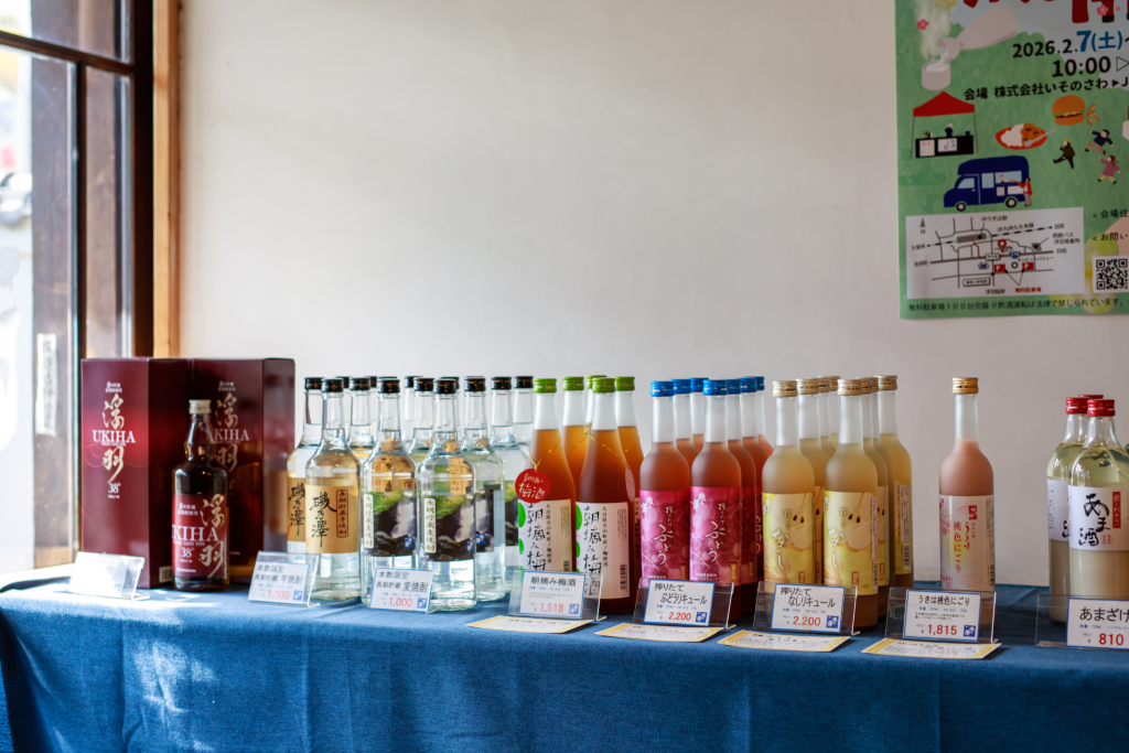準備的酒款包括:使用最高級酒米大量精磨而成的細膩大吟釀、餘韻輕盈的純米酒、香氣華麗、口感柔和甘甜的純米吟釀、帶有清爽酸味與汽水般香氣的特別純米酒、引出當地米旨味的純米大吟釀、此外,還有使用附近採收梅子釀製、口感溫潤柔和的梅酒。