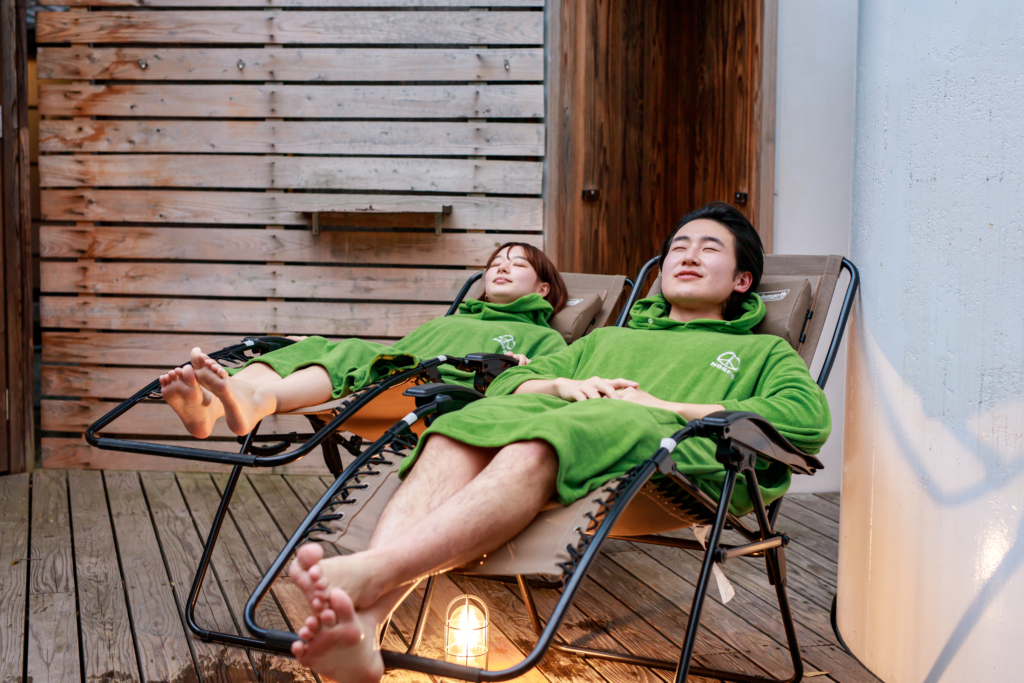 披上三溫暖斗篷,在戶外椅子上坐下,視線所及只剩天空。原本緊繃的時間感,慢慢鬆開。