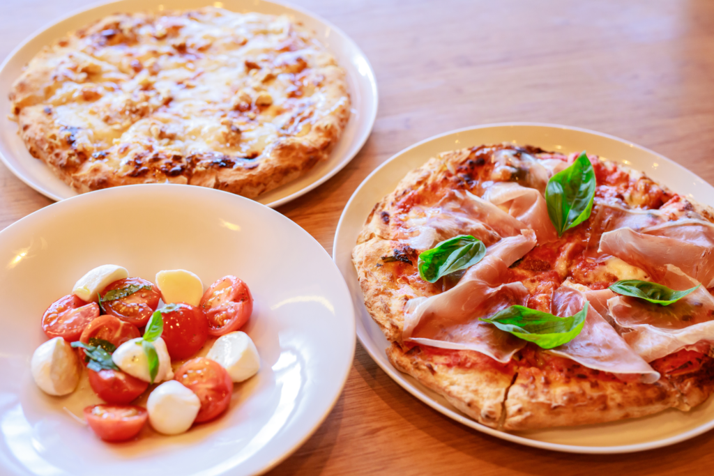 我們點了:生火腿瑪格麗特披薩、起司、核桃與蜂蜜披薩、卡布里沙拉、咖啡。柔和晨光灑落,溫熱料理與安靜時間交織。這不像觀光地的早餐,更像是富足日常的延伸。