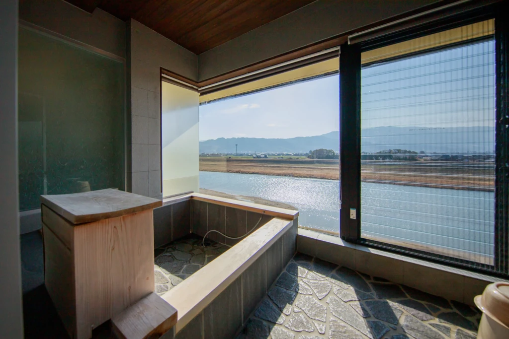 作為旅館的一大核心,是將溫泉引入各個客房,並以「隱居式旅宿」為概念重新改裝。餐廳採用包廂形式,避免與其他客人碰面,也體現了這樣的理念。即使是同一價位的房型,也會設定不同的概念,從這點也能感受到他們希望「調整與完善整段住宿時光」的用心。面向筑後川的河景視野,為這份靜謐增添了剛剛好的開闊感。