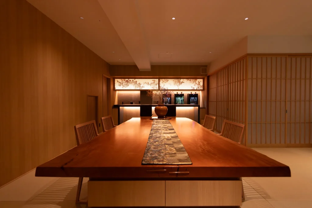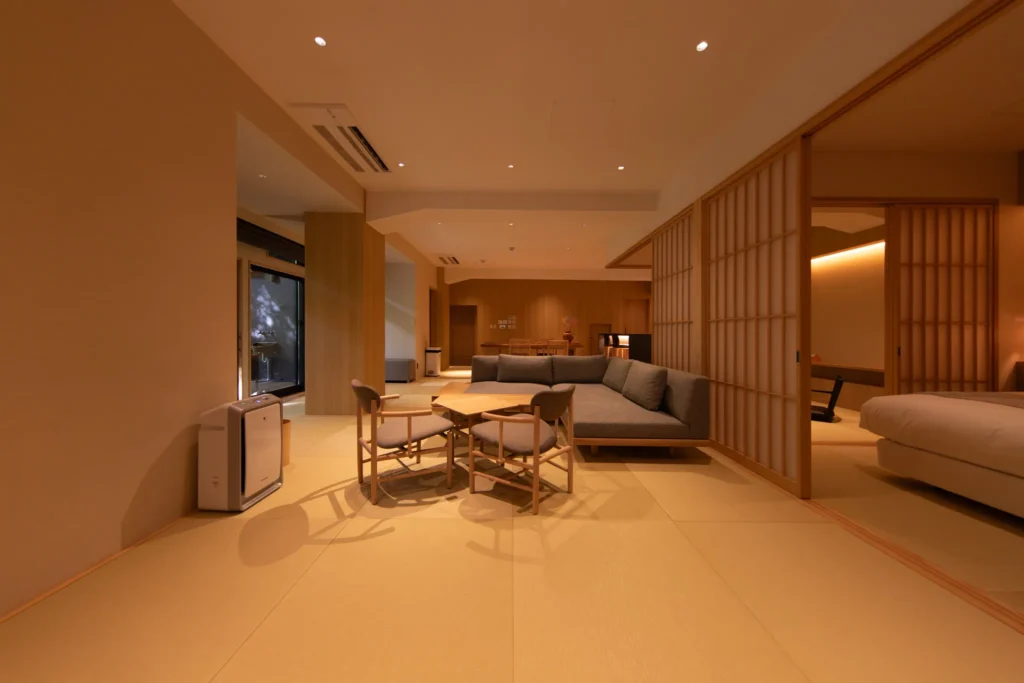 迎面而來的是柔和淺蔥色的榻榻米與一枚整木製成的櫸木吧檯。窗外綠竹搖曳,湯川的水聲悠然傳來。夏日微風拂面,冬夜可圍坐壁爐旁欣賞跳動火光,靜靜感受四季流轉的氣息。