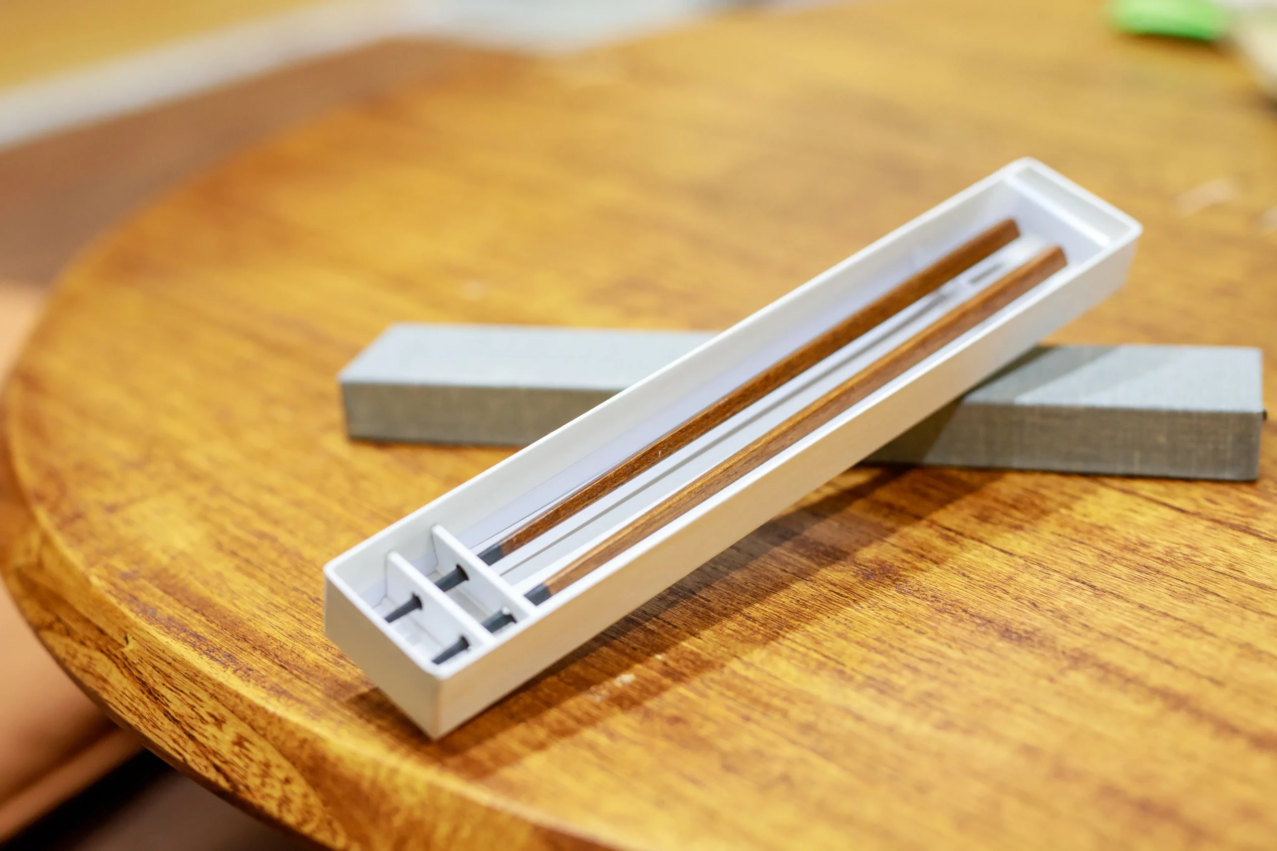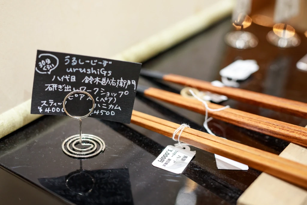 コースは箸の頭部(「天」)を研磨して模様を出すコース(3,000円~)、箸の持ち手部分(「持ち代」)の研ぎ出しコース(4,000円~)、漆アクセサリー用パーツを使った研ぎ出し体験(3,000円~)など複数あり、お箸以外の小物作りも楽しめます。国産天然木の本漆など高品質な素材を使用するので、綺麗な仕上がりになると好評です。
