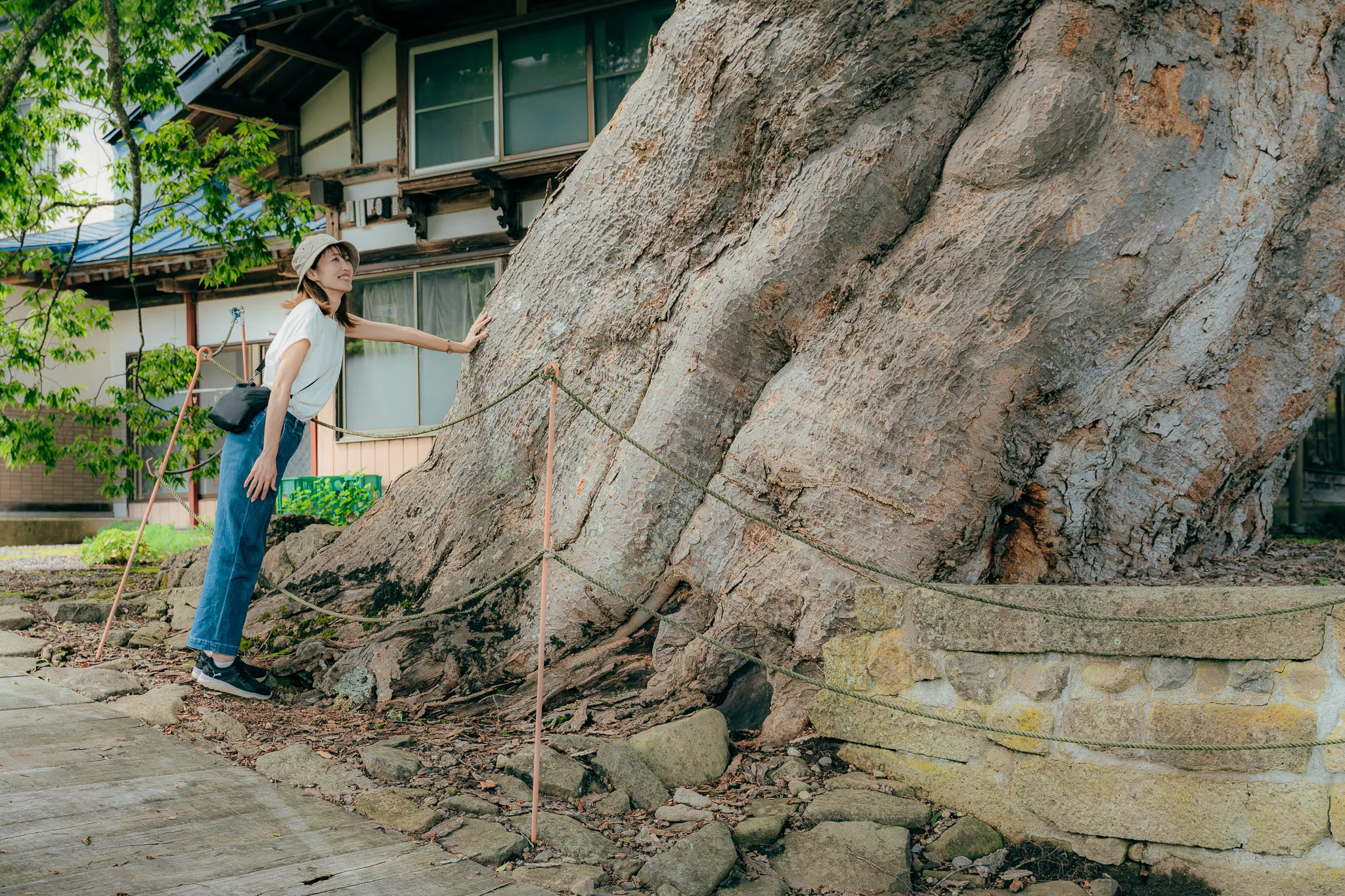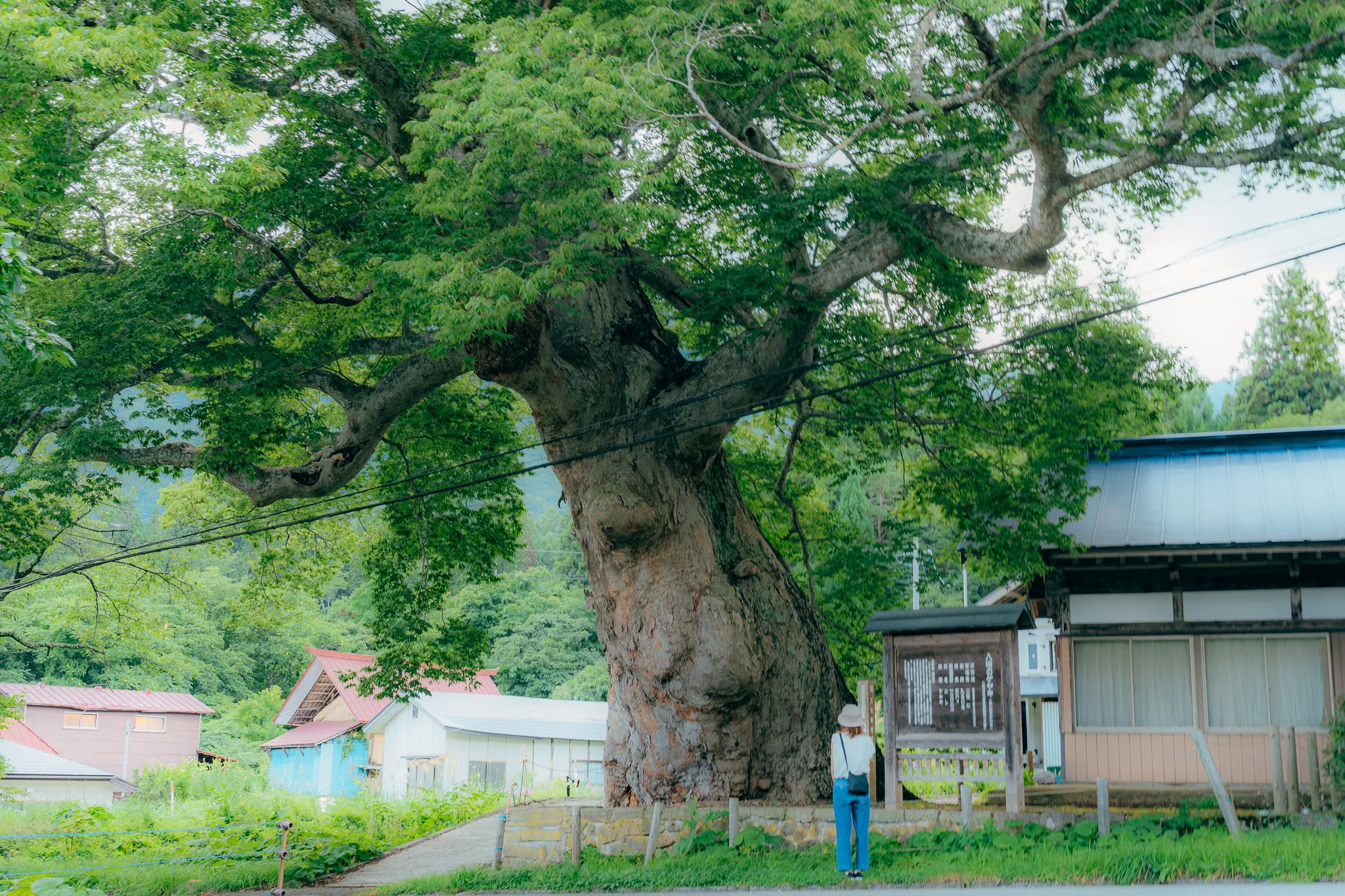 「八幡の大ケヤキ」と「長寿の水」は非常に近い立地のため、短時間でまとめて巡ることができます。まず県道沿いにある八幡の大ケヤキに立ち寄り、その雄大な姿を間近に感じましょう。そこから車で5分ほど山側へ進むと「長寿の水」に到着します。道中の景色も美しく、車窓から南会津の豊かな自然を楽しめます。