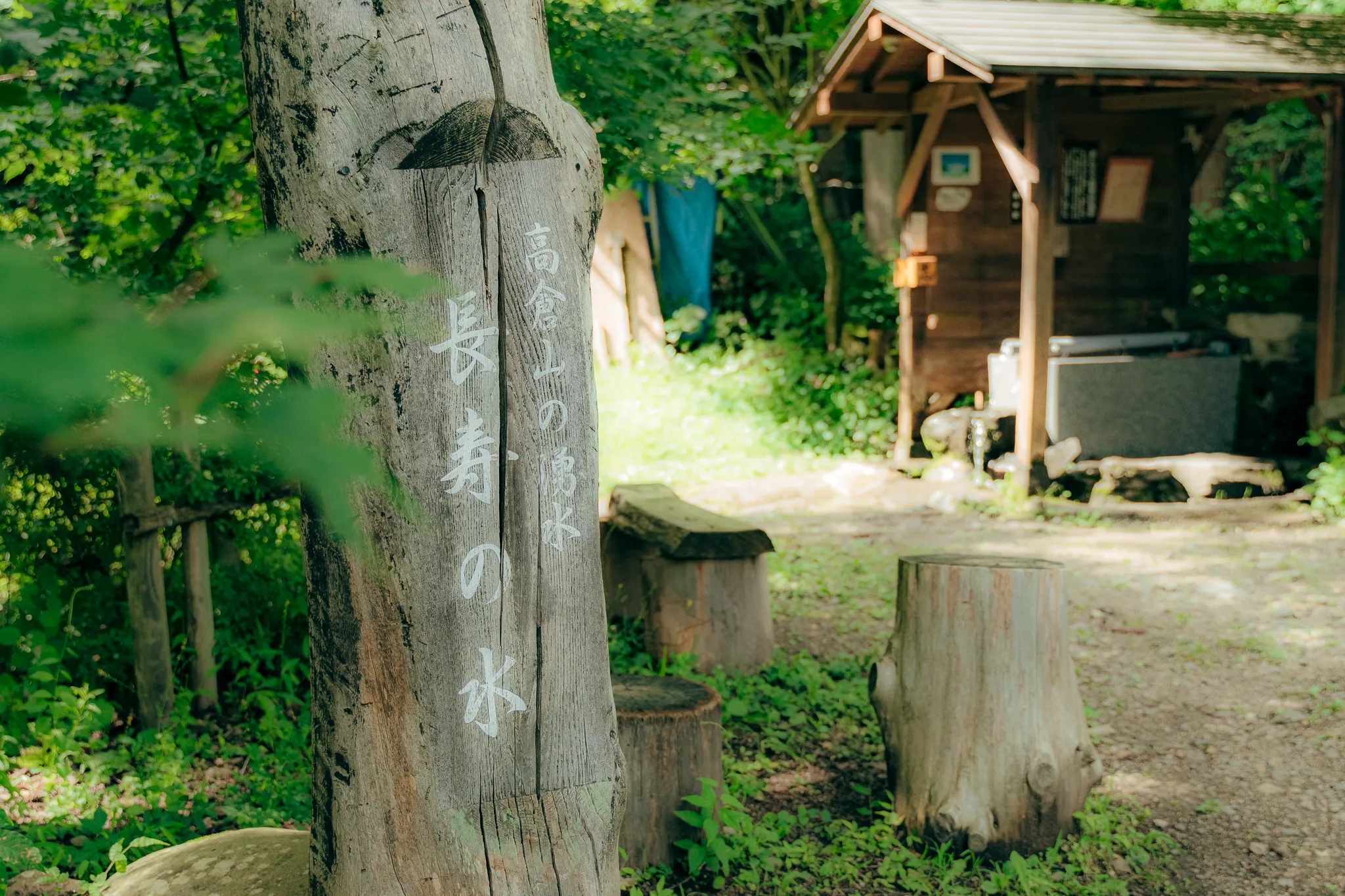 一方の長寿の水は、標高1308mの高倉山の裾野から湧き出す清冽な湧水です。季節を問わず枯れることなくこんこんと水が湧き続けており、常に豊富な水量を保っています。水温は約10度と冷たく、味わいは癖がなくまろやかでとても飲みやすいのが特徴です。