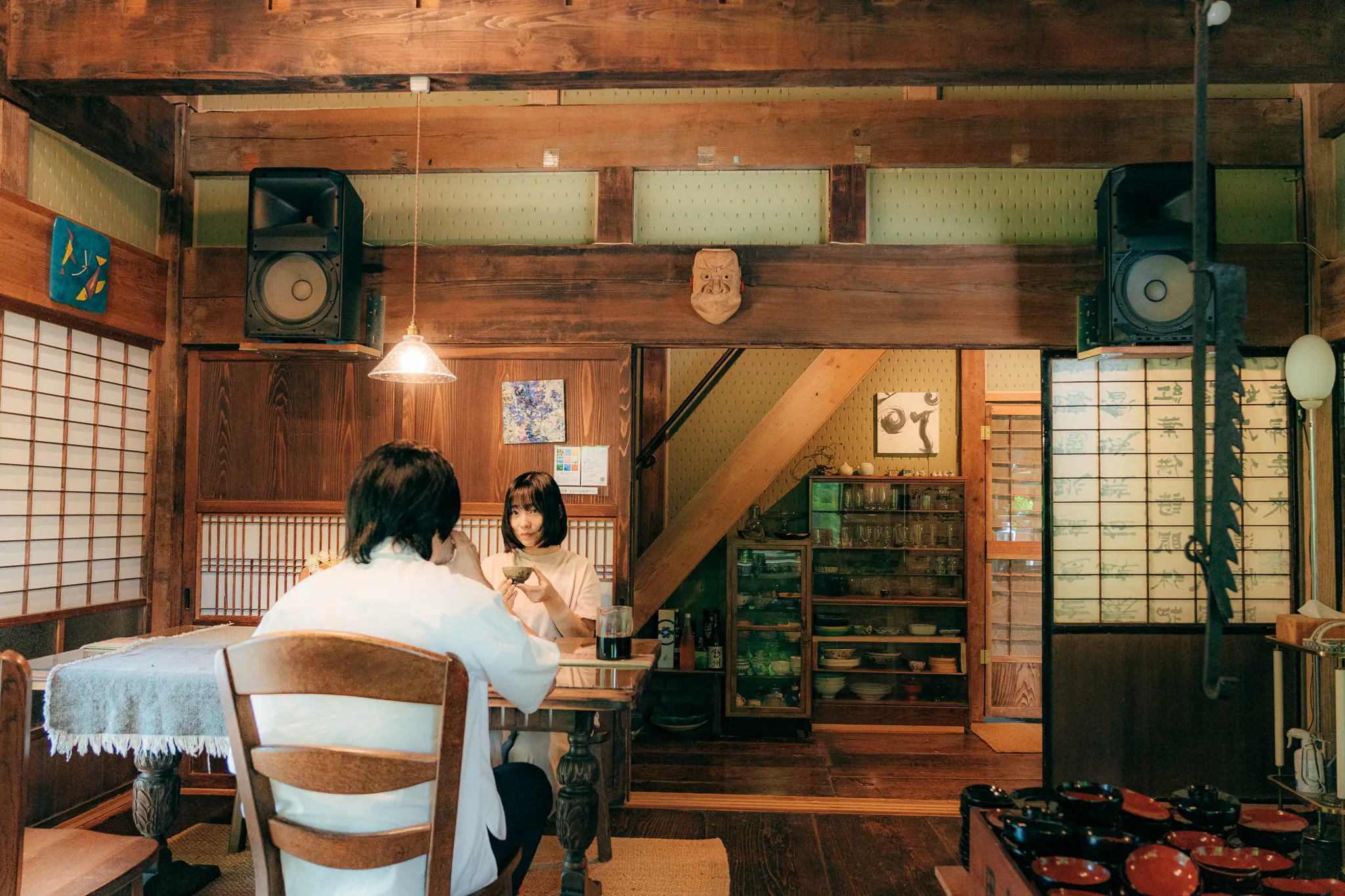 まずは静かな店内でじっくりと作品を鑑賞しましょう。設亮庵ブレンドや季節のランチを味わいながら、河中さんから作品制作の裏話や、集落の歴史など、さまざまなお話を伺うことができます。窓辺の席からは四季折々の自然が窓いっぱいに広がります。寒い季節には薪ストーブがじんわりを身体を温めてくれます。