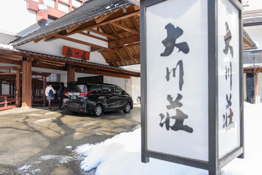 エクストリーム温泉から戻ったあとは、ハイヤーに乗り込み、大川荘 へ向かいます。移動時間はおおよそ1時間。