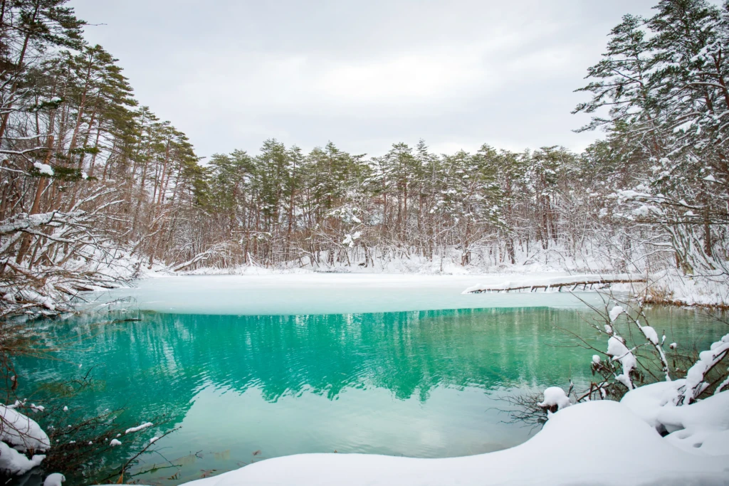 真っ白な雪に囲まれた湖面は、青さがいっそう引き立ち、角度によっては青というよりも、エメラルドのような宝石を思わせる輝きを見せていました。