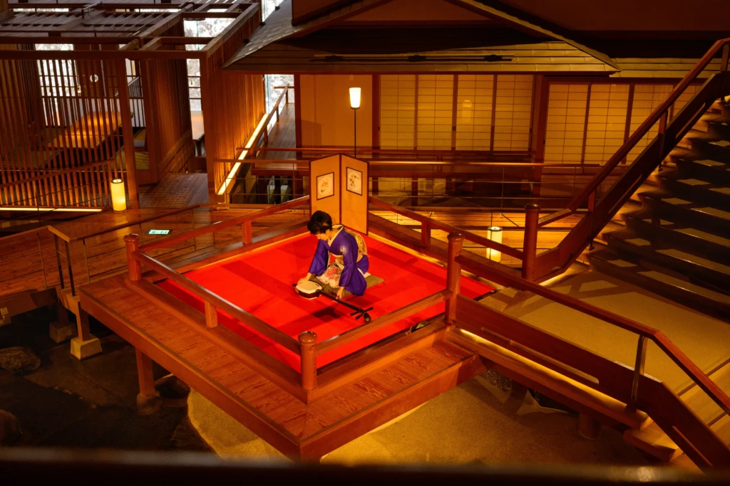 ロビーは吹き抜けの大空間で、上へ視線が吸い込まれていく。その中心にあるのが、館内の象徴とも言える「浮き舞台」。ここで聴く三味線の生演奏は、音量ではなく“響き”が残るタイプで、気づくと呼吸が深くなっていました。