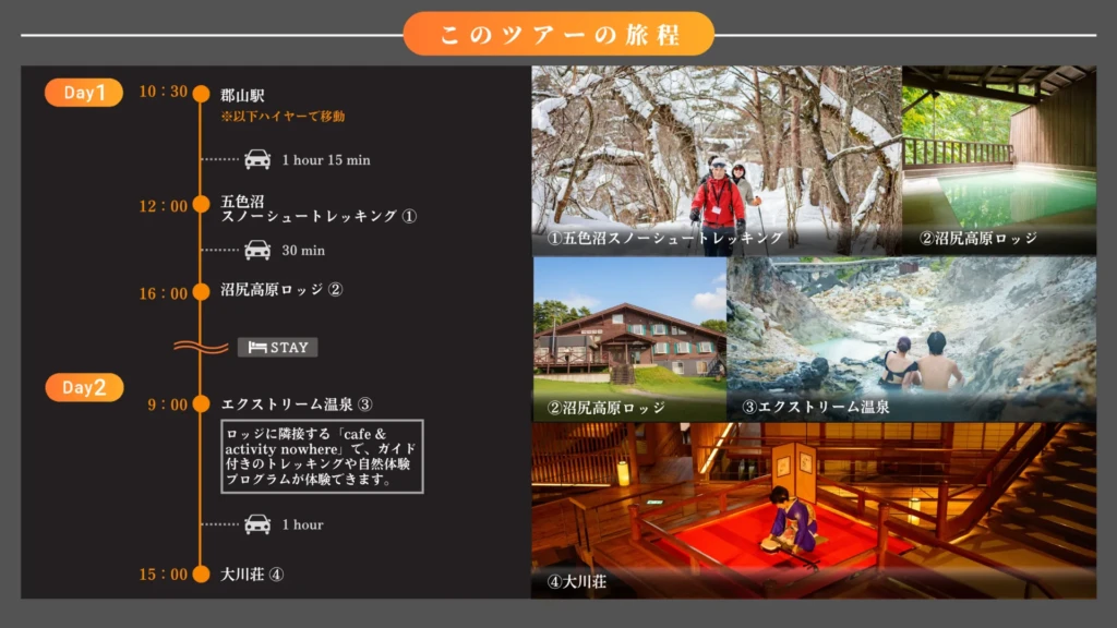 | Duration | 3 Days ・Day 1 – 郡山・裏磐梯・沼尻 ・Day 2 – 芦ノ牧 ・Day 3 – 芦ノ牧 |
