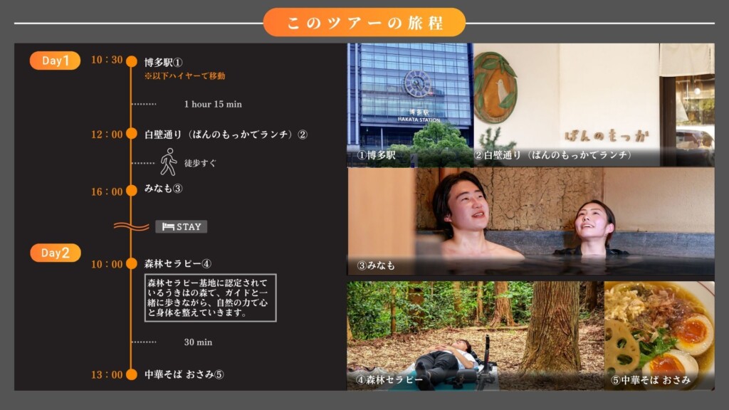 | Duration | 2 Days ・Day 1 – 白壁通り、みなも ・Day 2 -森林セラピー、中華そば おさみ |