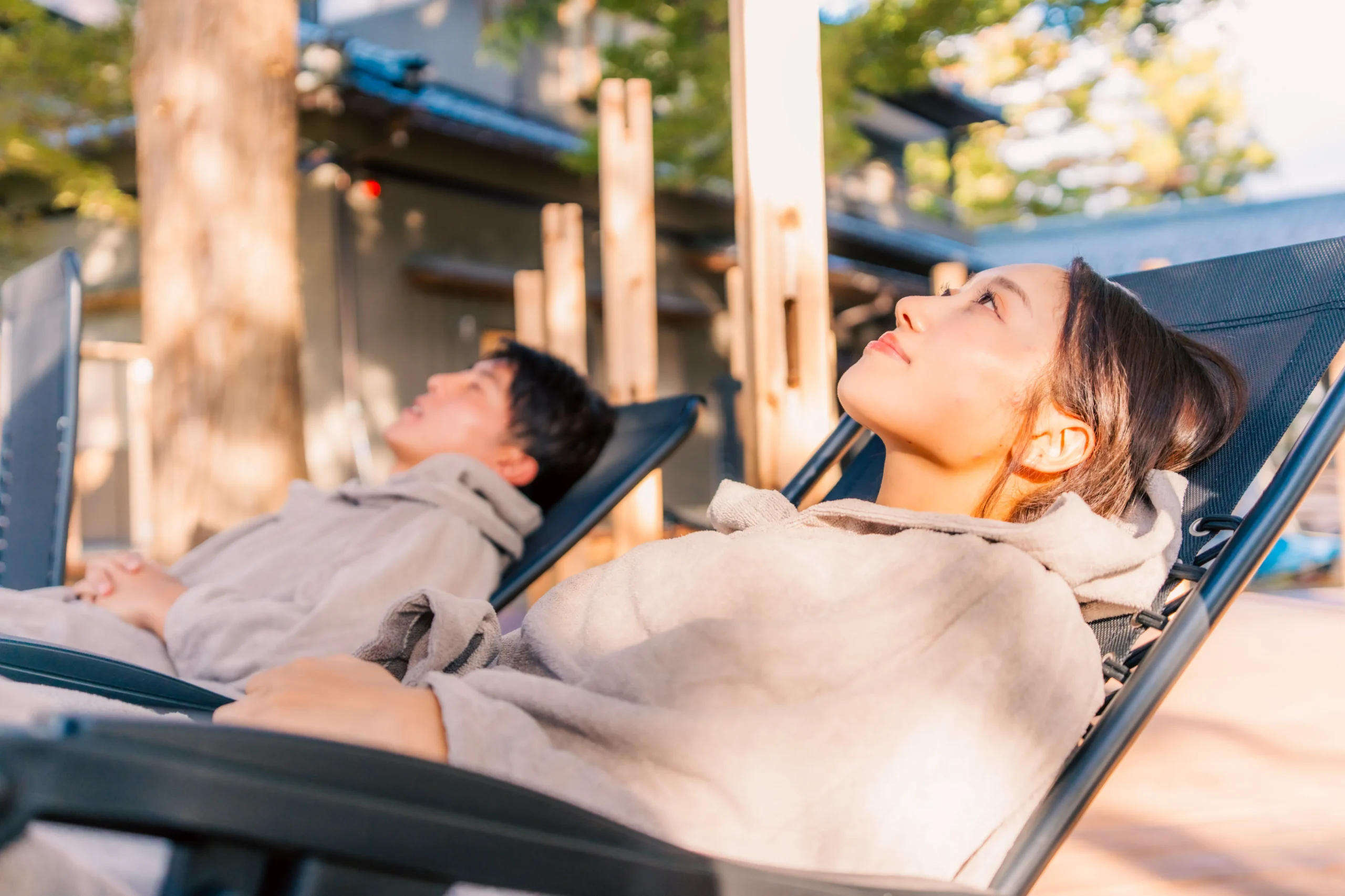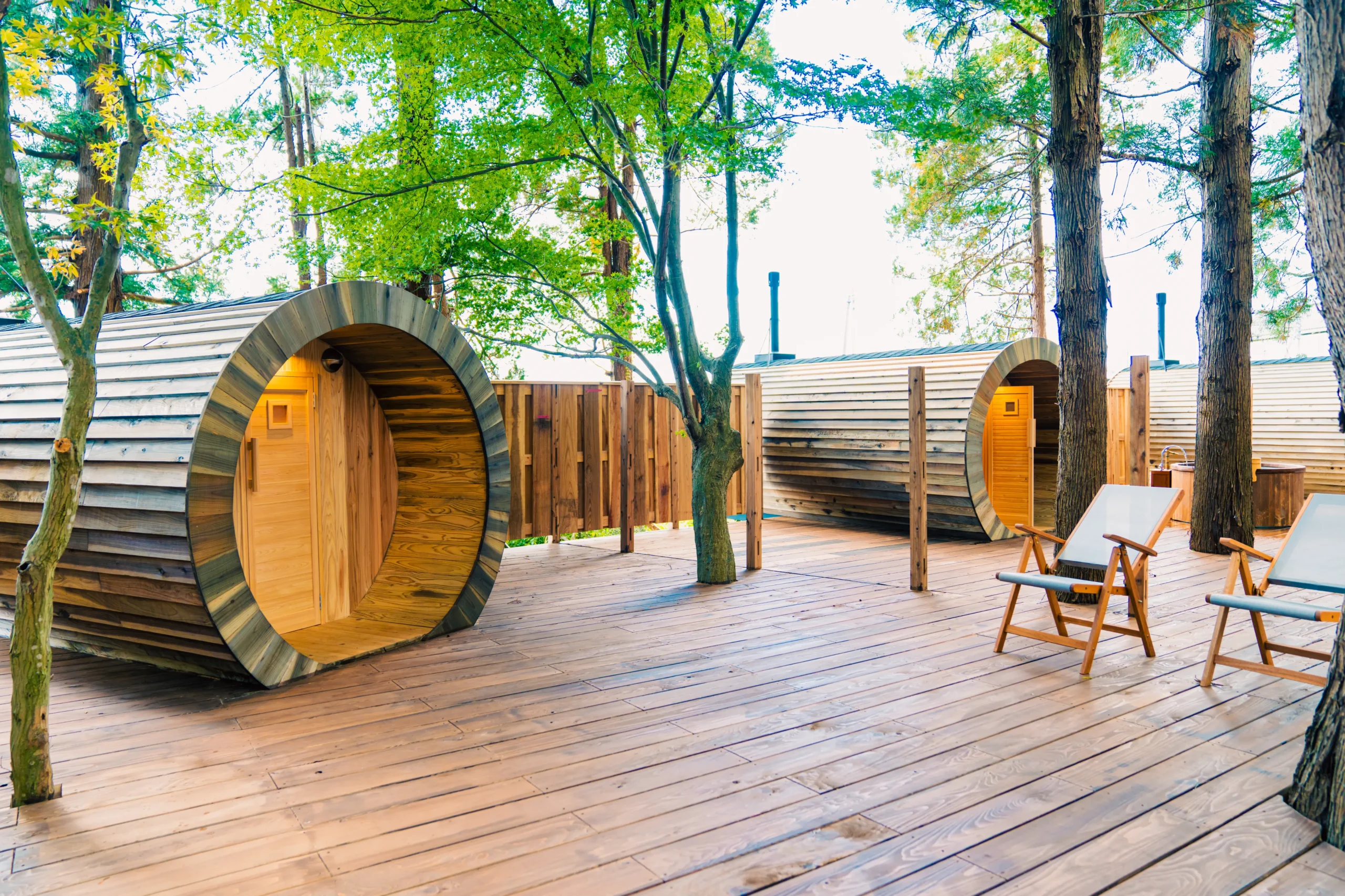 全面ウッドデッキのサウナエリアには裸足で上がることができ、インフィニティチェアやベンチで自由にくつろげます。木漏れ日と風の音、緑の香りに包まれて深いリラックスが味わえます。