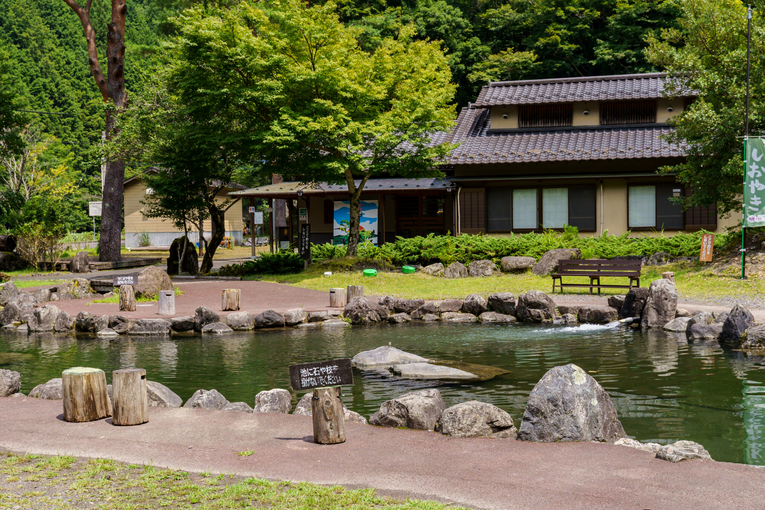 施設がある阿多古地区は、環境省の「名水百選」にも選ばれたことがある阿多古川の上流に位置しており、周囲を深い緑と澄んだ空気に包まれています。都会の喧騒を離れ、せせらぎの音を聞きながら、自然と一体となってのんびりと過ごせる癒やしの空間が広がっています。