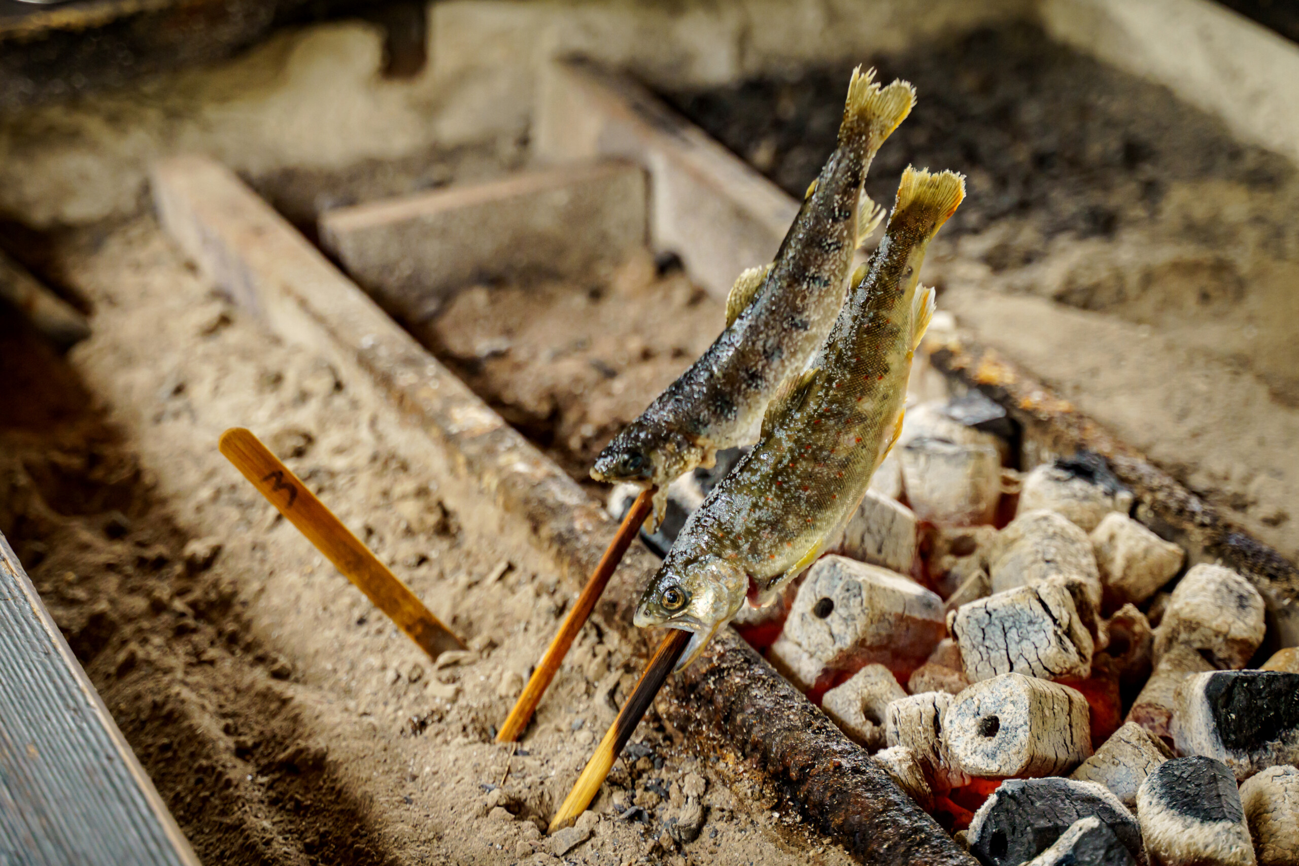食事のメインは、なんといっても「ヤマメの塩焼き」や「ヤマメの天ぷら」。炭火でじっくりと焼き上げられた身はふっくらとしていて、皮はパリッと香ばしく、清流育ちならではの臭みのない上品な味わいが口いっぱいに広がります。山菜など地元の食材を使った料理と一緒に楽しめば、身も心も満たされる至福のランチタイムを過ごせるでしょう。